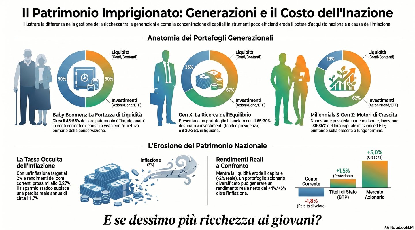 La propensione al rischio diminuisce fisiologicamente con l'età, ma in Italia questo fenomeno è amplificato da una scarsa educazione finanziaria di base. Le generazioni più anziane detengono una quota sproporzionata della ricchezza nazionale in strumenti a rendimento nullo o negativo.