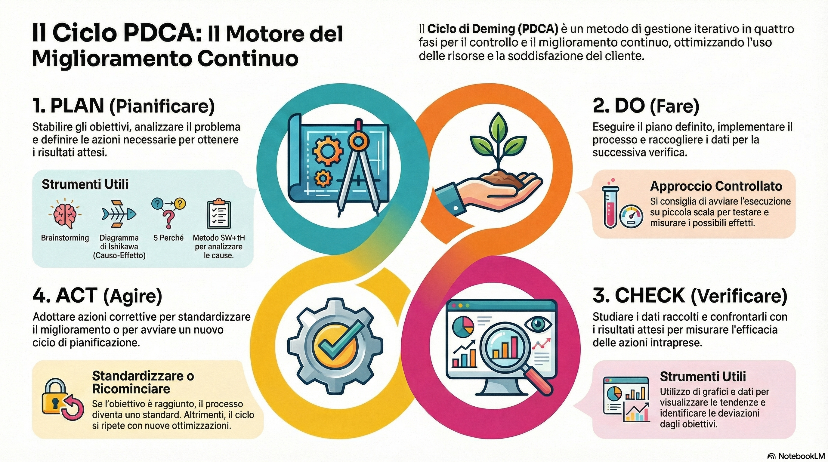È qui che entra in gioco il Ciclo di Deming (PDCA), uno dei metodi più efficaci e universalmente riconosciuti per la gestione del miglioramento continuo e la risoluzione sistematica dei problemi. Questo articolo esplorerà in dettaglio le sue quattro fasi, arricchendole con strumenti pratici che trasformano un modello teorico in una potente cassetta degli attrezzi per affrontare qualsiasi sfida con logica ed efficacia.
