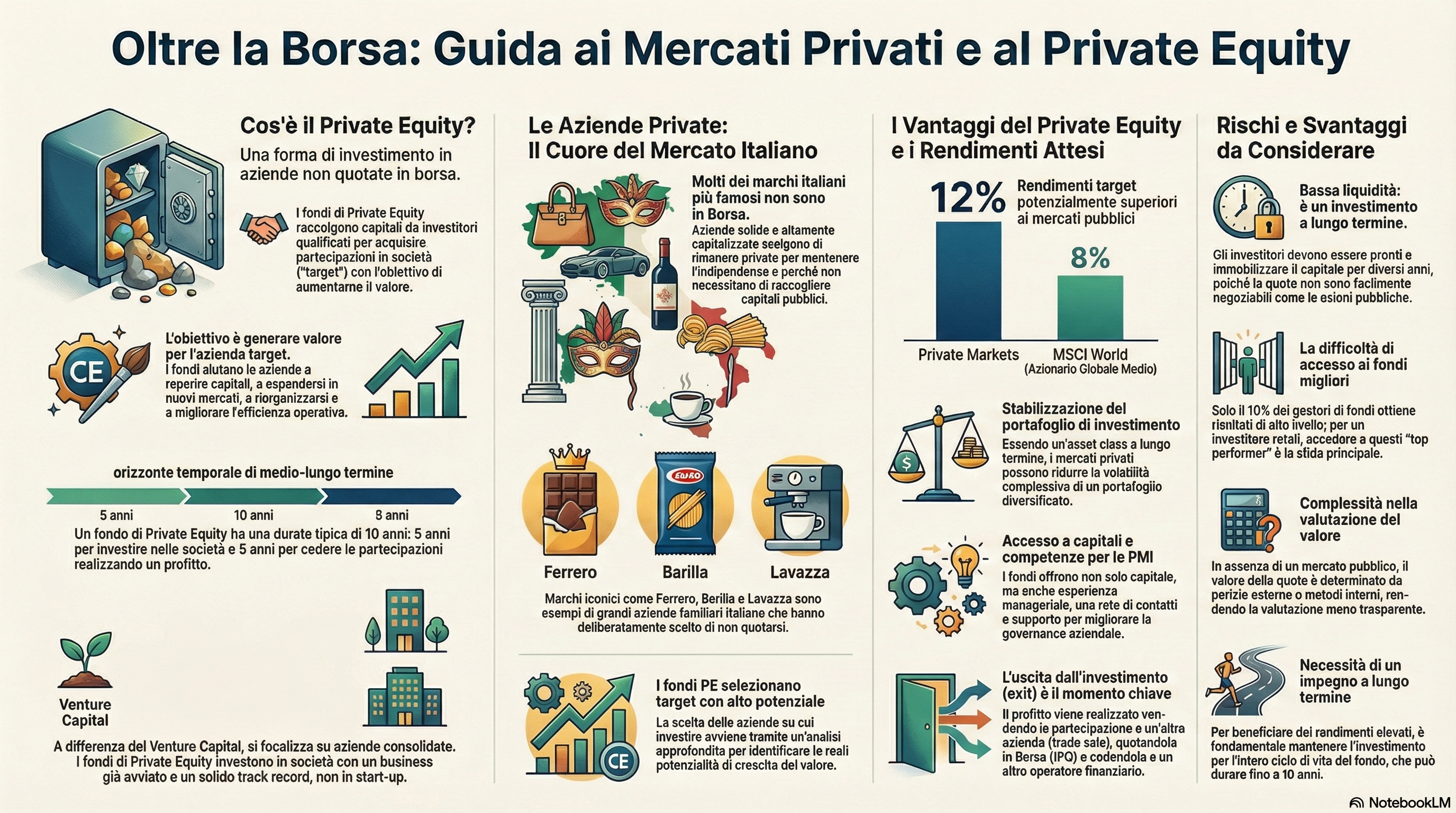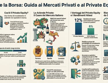 Nomi come Ferrero e Barilla evocano immediatamente immagini di successo e solidità nel panorama imprenditoriale italiano. Sono aziende leader a livello mondiale, radicate nella nostra economia, ma con una caratteristica comune: non è possibile acquistare le loro azioni in Borsa. Questa scelta, condivisa da molte altre eccellenze, le rende inaccessibili all'investitore tradizionale. Esiste però una soluzione per partecipare alla loro crescita: i "Private Markets". In un'epoca di mercati pubblici volatili e tassi di interesse in evoluzione, l'accesso a fonti di rendimento decorrelate è diventato un obiettivo cruciale per l'investitore moderno. Attraverso strumenti come i fondi di "Private Equity", è possibile investire in questo universo di aziende private ad alto potenziale. Questo articolo spiegherà in modo chiaro cosa sono i Private Markets, quali vantaggi e rischi comportano e come, oggi, sia finalmente possibile accedervi.